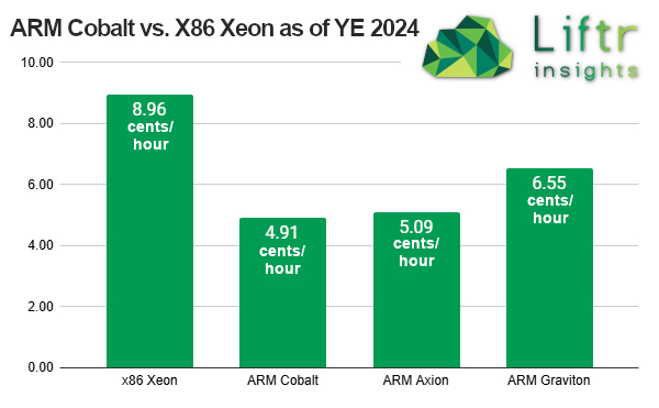 1. Reduced costs: Cost savings to the cloud provider have also translated to reduced customer prices. For instance, Liftr data show that Arm instances are on average 49.2% cheaper per core than X86. A Cobalt instance on Azure is 40.9% less per hour than a similarly specced Intel X86 instance. While assessing a comparable AMD instance was more difficult, a similar Cobalt instance that included temporary storage was 20% cheaper than a comparable AMD instance without temporary storage. Additionally, some of the Cobalt instances have more premium features available. More on Cobalt in a future article.